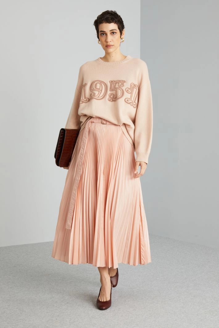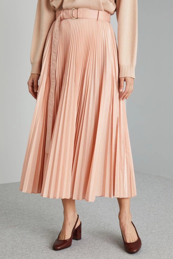 Long flared skirt in silk blend taffeta with pleated details. With belt and belt loops at the waist. Invisible zip fastening and hook on the side. Matching belt.