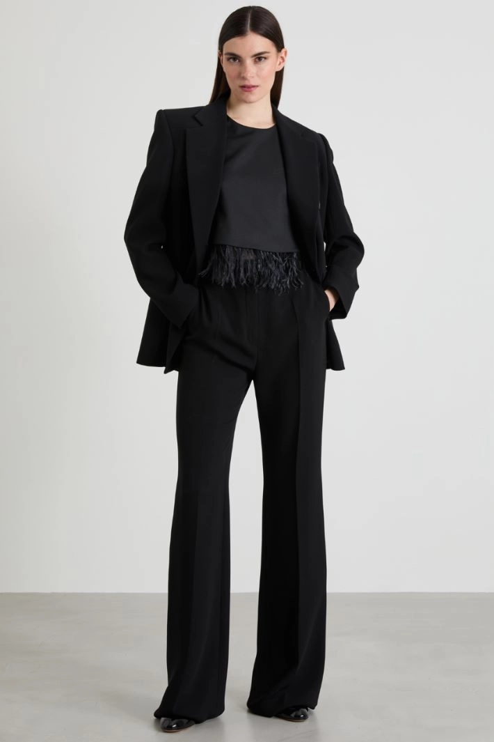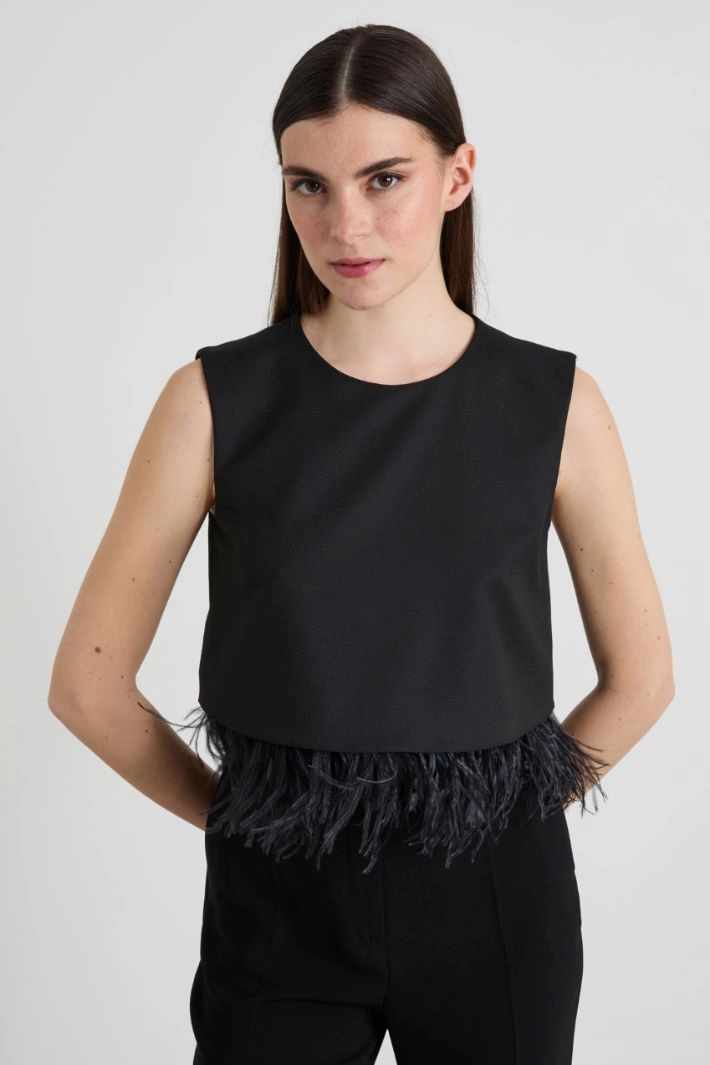 Straight-cut top in viscose-blend gabardine, with crew neck and removable feather detail at the hem. Invisible zip fastening at the center back. Lined.
