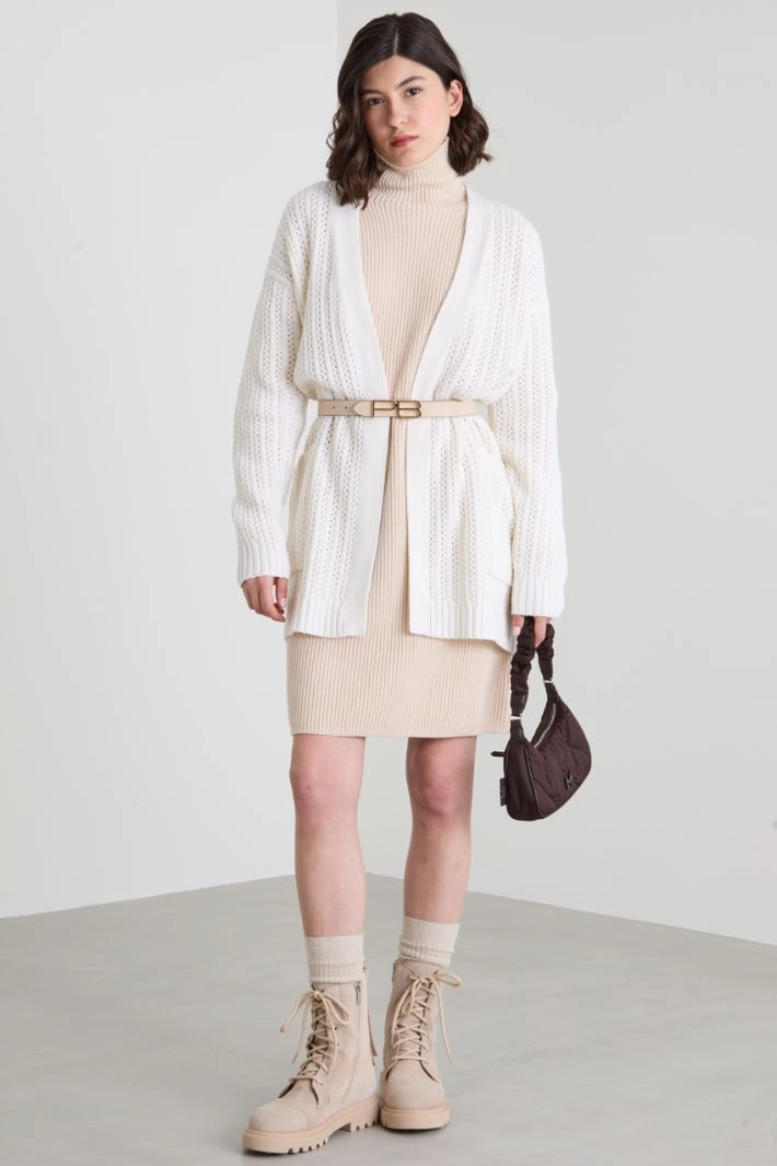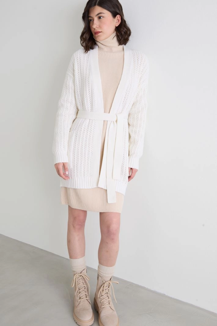 Loose-fit cardigan in wool and cashmere yarn finished with an openwork ribbing, with a V-neck and patch pockets on the sides. Fastening with a coordinated belt.