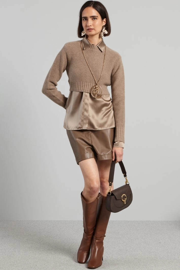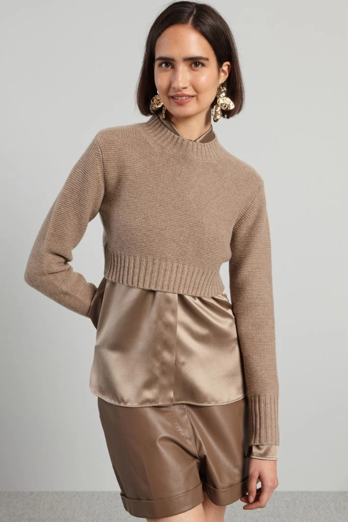 Cropped, slim fit, long-sleeved sweater in pure cashmere yarn in a links-stitch knit. Crew-neck style finished with ribbed edges.