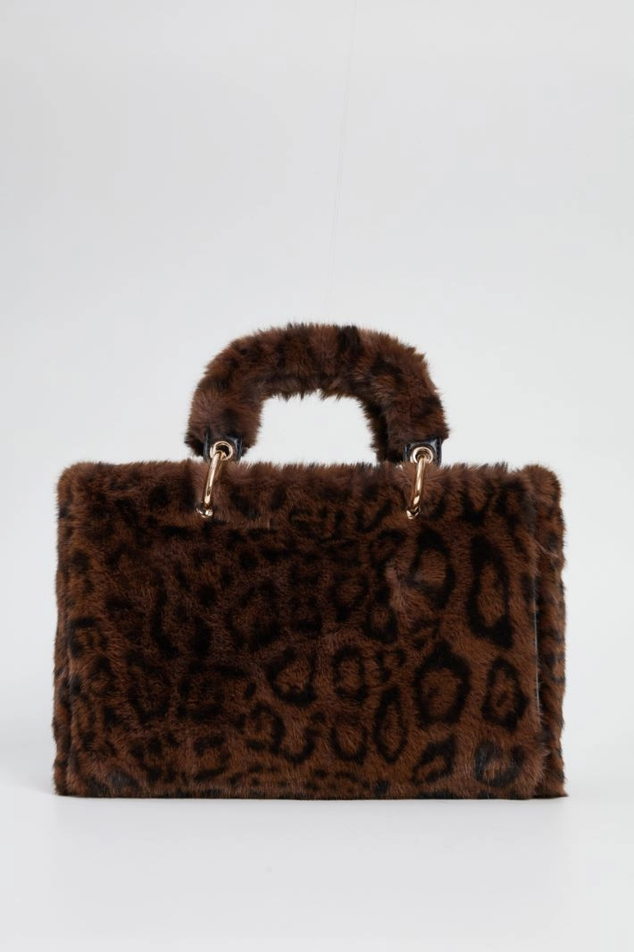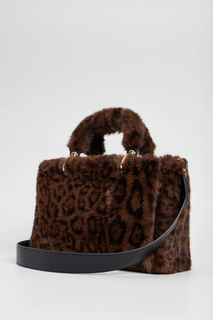 Bag in plush-effect faux leather with spotted print, double handle, removable shoulder strap and internal pockets. Zip closure.