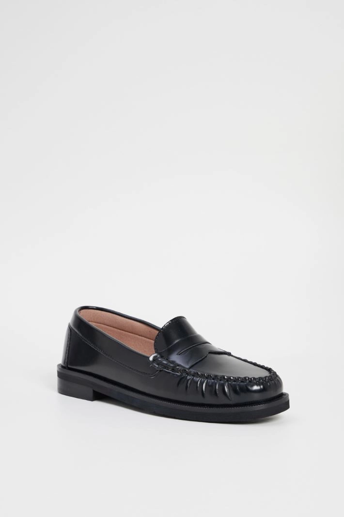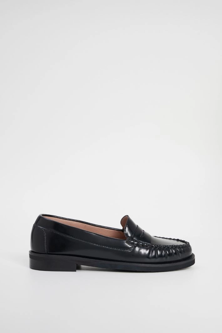 Moccasins in genuine leather with a glossy finish, featuring stitching on the upper. Leather lining and rubber sole.