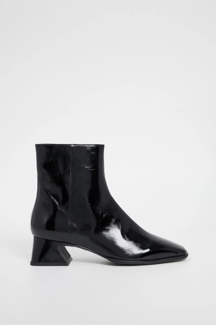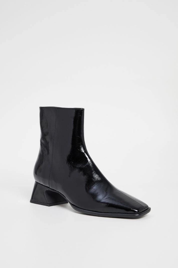 Ankle boots in genuine patent leather, with stitched cut on the upper, square toe, trapezoid heel and zip closure on the inside. Rubber sole.