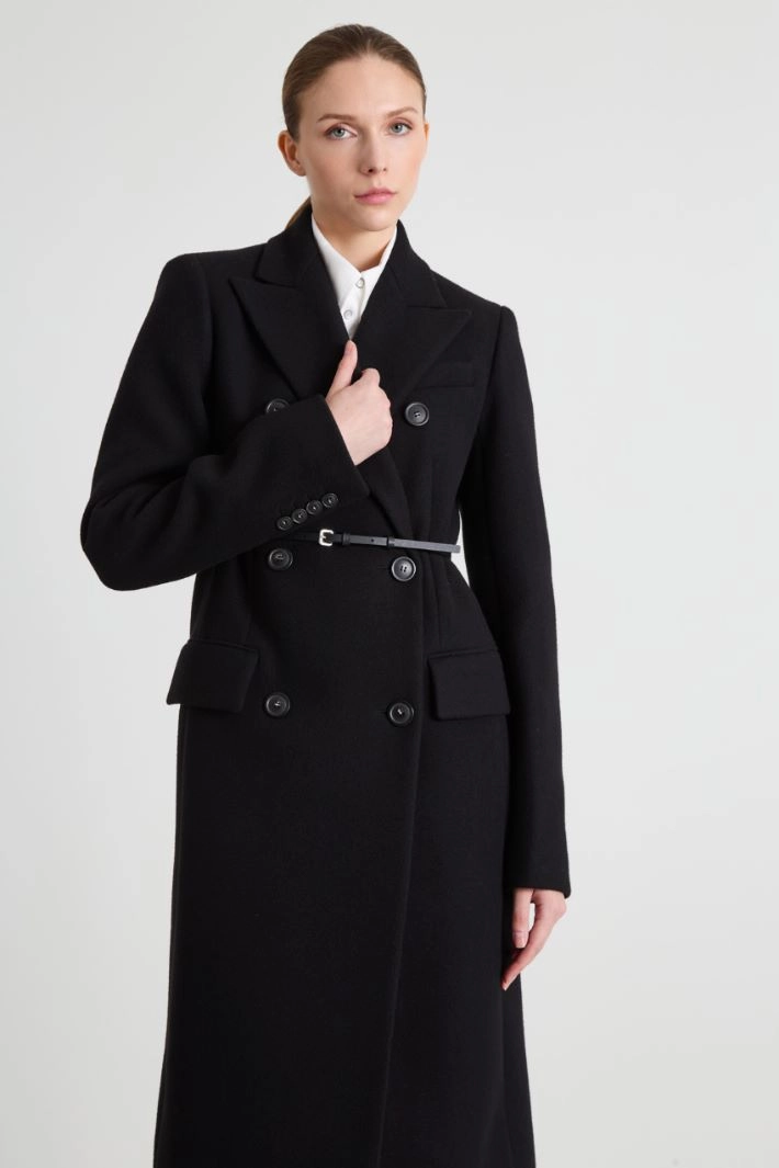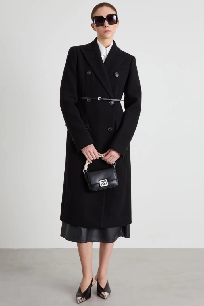 Long, fitted coat in double wool and cashmere drap, with peak lapel, long sleeves with buttons, chest pocket and double-welt side pockets with flap. Central vent on the back and double-breasted fastening with buttons. Thin belt in real leather. Lined.