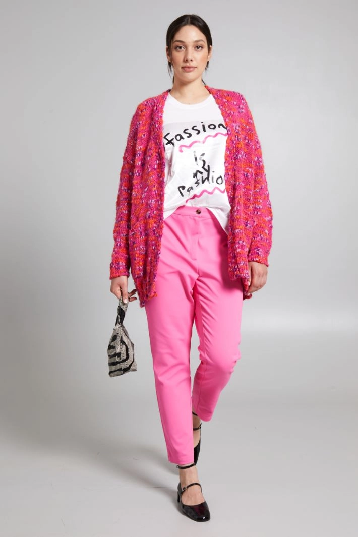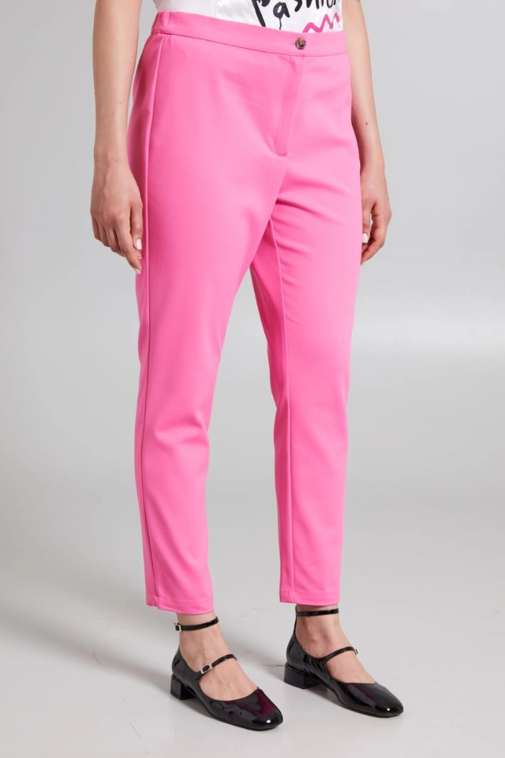 Slim-fit trousers in stretch cotton blend canvas, with elastic insert at the waist on the back and fastening with a hidden zip and button.