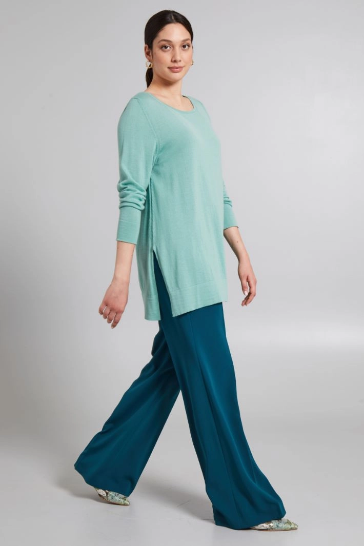 Long straight-cut sweater in pure wool yarn, with round neckline, long sleeves and side slits at the hem.