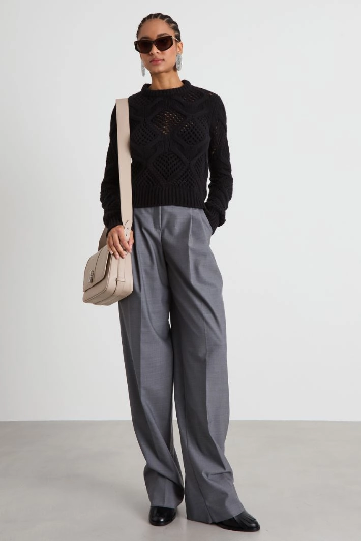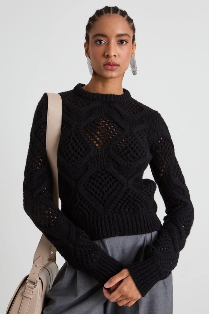 Regular-fit sweater in wool blend yarn with diamond patterns and openwork details, crew neck and long sleeves.