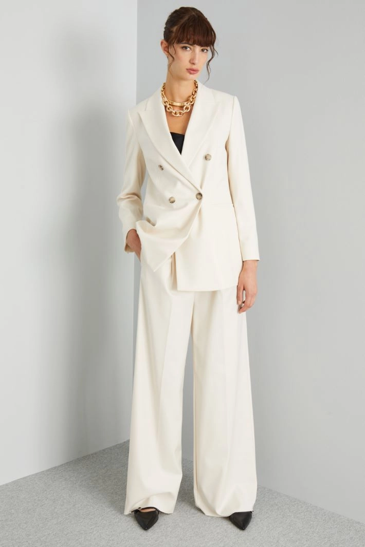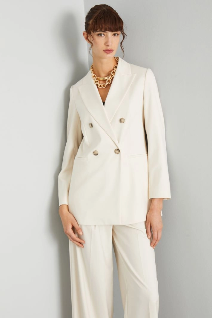 Straight-cut blazer in stretch viscose blend batavia, with lapel collar, long sleeves with slit at the bottom, welt pockets and slit at the back. Double-breasted button fastening. Lined.