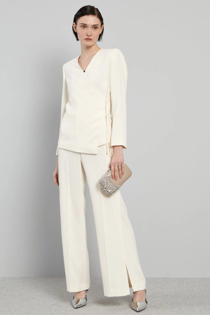 Wrap-style envers satin jacket with crossed V-neck, long sleeves and fastening with laces on the side. Lined.
