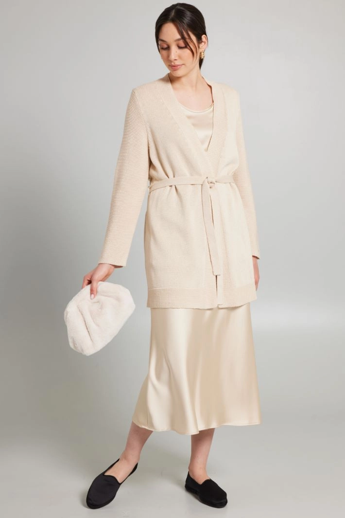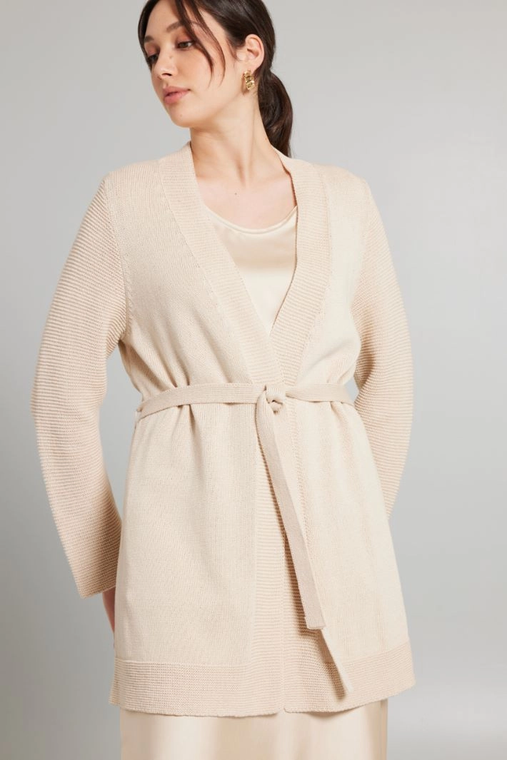 Long straight-cut cardigan in pure cotton yarn, with V-neck, long textured sleeves, ribbed profiles and fastening with a matching belt.