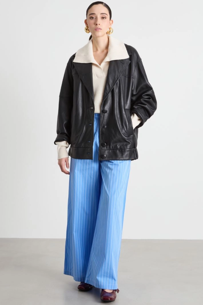 Oversized jacket in leather, with a lapel collar, long dropped-shoulder sleeves, welt pockets and an elasticated insert at the hem. Lined with jacquard fabric. Fastening with covered buttons.