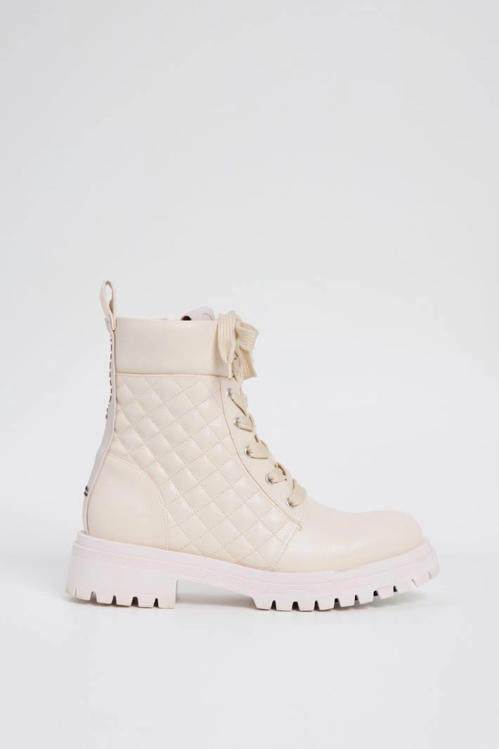 Faux leather combat boots with stitching on the sides, rounded toe, lacing with laces with metal hooks and zip on the inside. Rubber trekking sole.