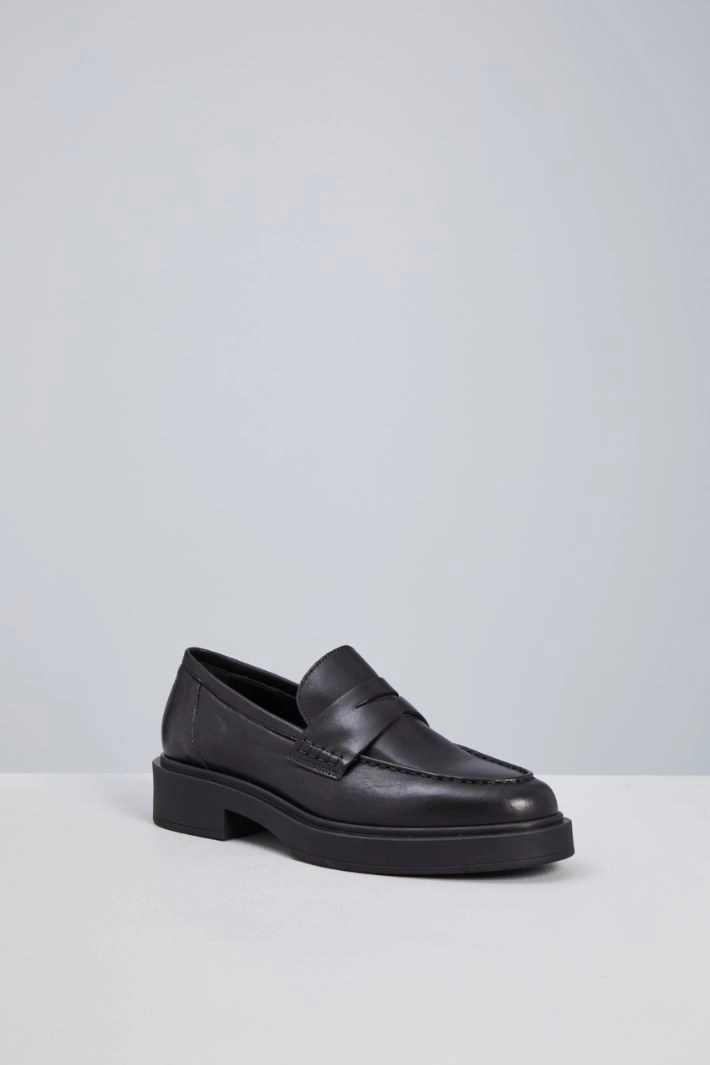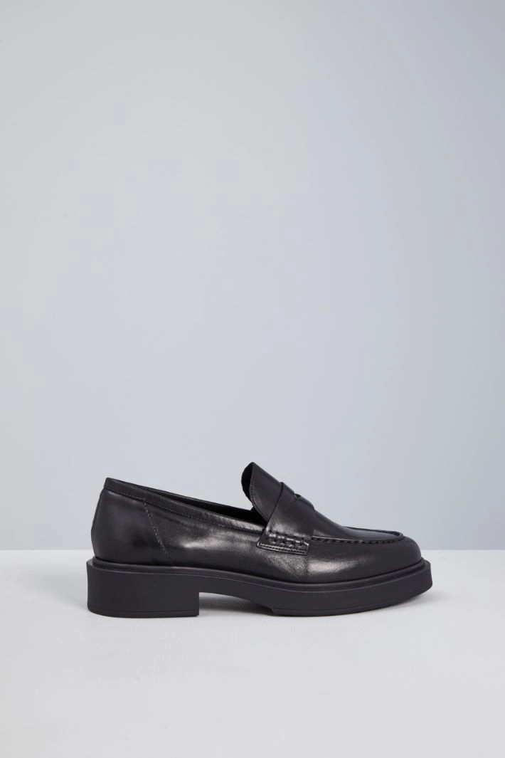 Moccasins in genuine leather with a shiny finish and a stitched pattern. Rubber sole.
