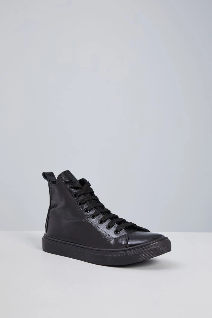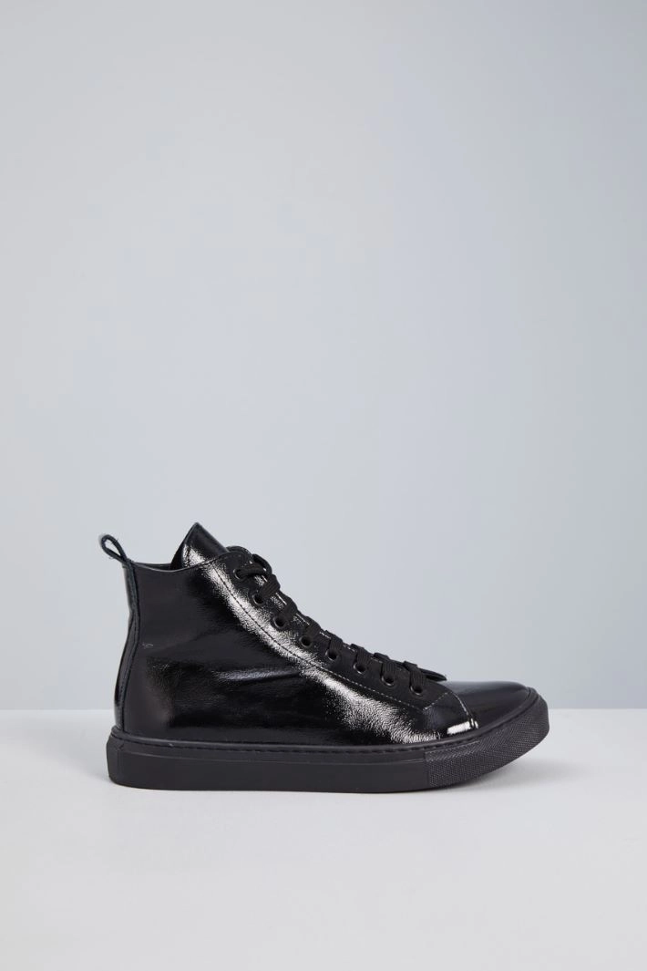 High sneakers in real patent leather, with lace closure. Leather lining, rubber sole.