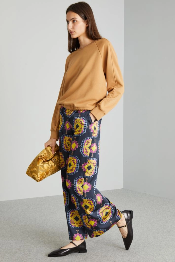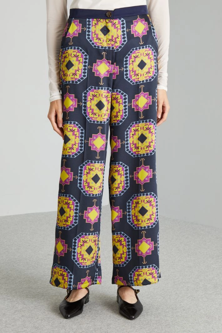 Loose-fit trousers in printed twill, with waistband, side French pockets and fastening with hidden zip and button.