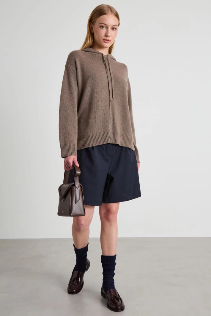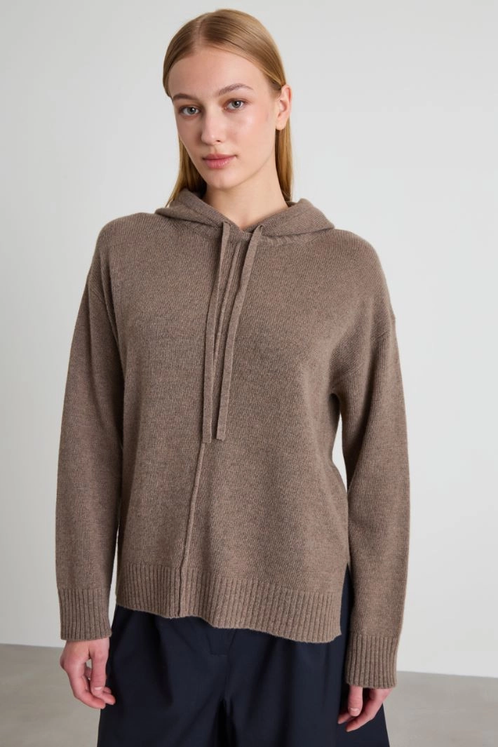 Soft-fit sweatshirt-style sweater in wool, viscose and cashmere blend, with a drawstring-finished hood, long dropped-neck sleeves, side slits and an asymmetrical hem that is longer at the back. Ribbed trim.