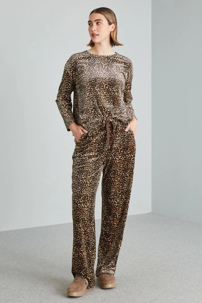 Loose-fit trousers in printed stretch velvet jersey, with drawstring and elastic insert at the waist, slant pockets on the front.