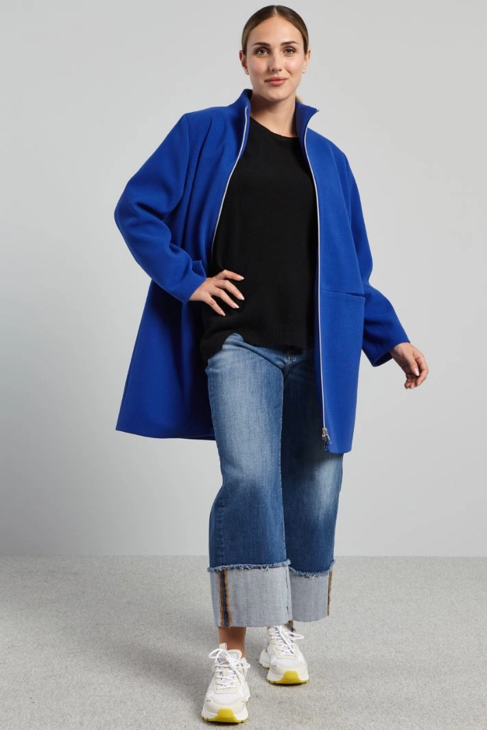 Long straight-cut jacket in jersey cloth with high collar, long sleeves, inset side pockets with invisible zip. Single-breasted zip fastening. Lined.