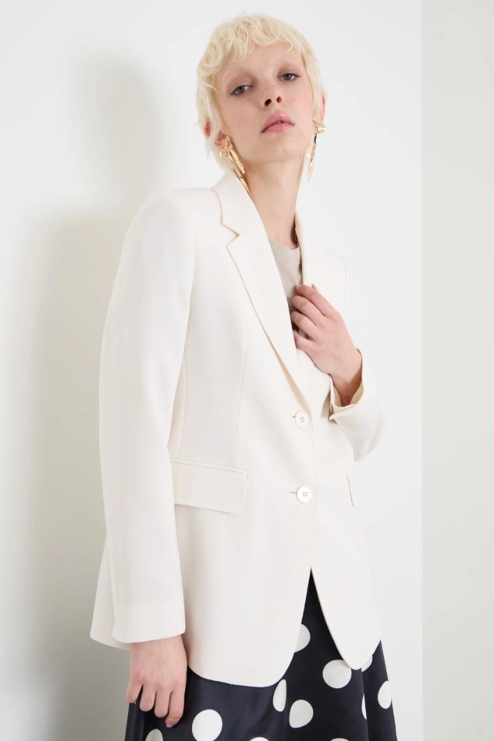 Slightly fitted cady blazer with topstitching, lapel collar, long sleeves with buttons, double-welt side pockets with flap and central vent on the back. Single-breasted fastening with buttons. Lined.