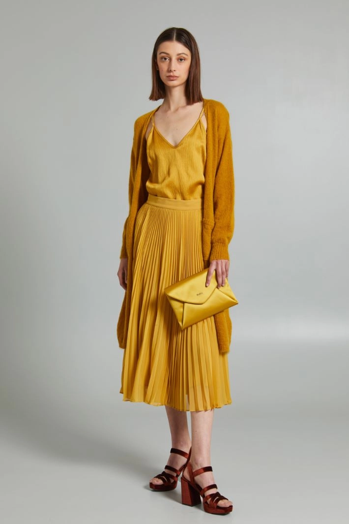 Midi pleated skirt with a slightly mermaid silhouette in georgette and lurex yarn inserts, belt at the waist and invisible zip fastening on the side. Lined.