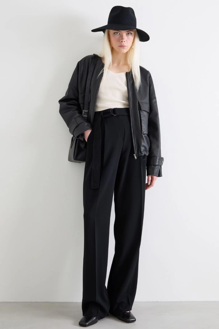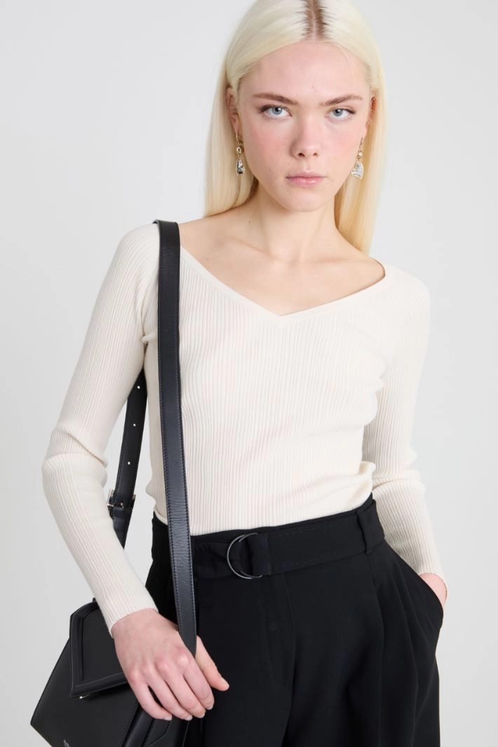 Fitted sweater in ribbed viscose blend yarn, with a V-neck and long sleeves.
