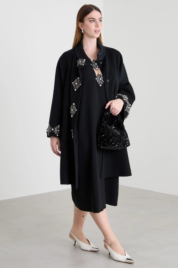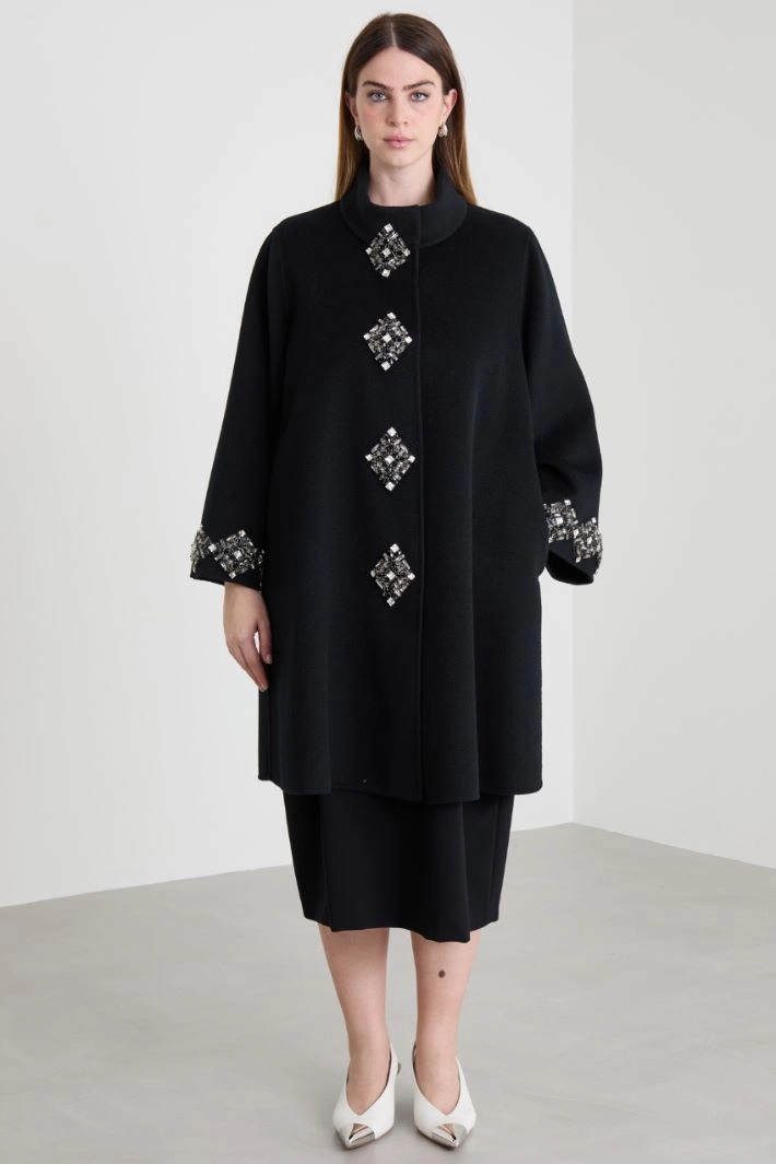 Flared coat in double pure wool sable drap, with embroidered rhinestone motif, stand-up collar, long sleeves, inset side pockets and single-breasted fastening hidden by buttons. Unlined.