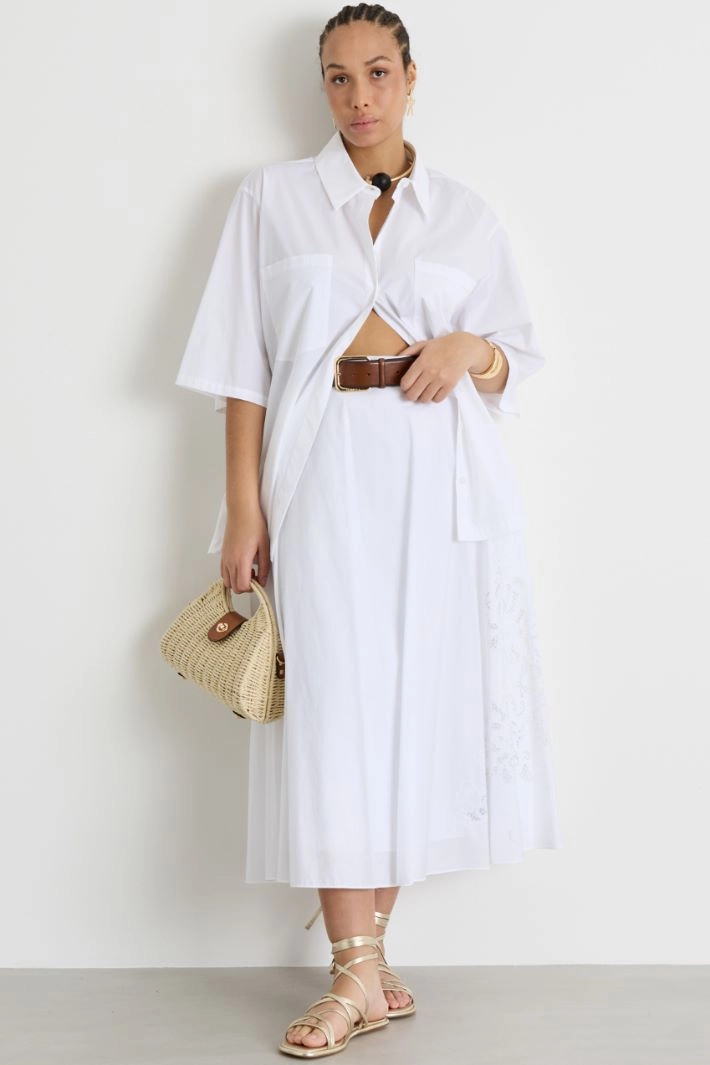 A-line skirt in pure cotton poplin, featuring cutwork embroidery and side pockets. This lined piece fastens with an invisible zip and a button.