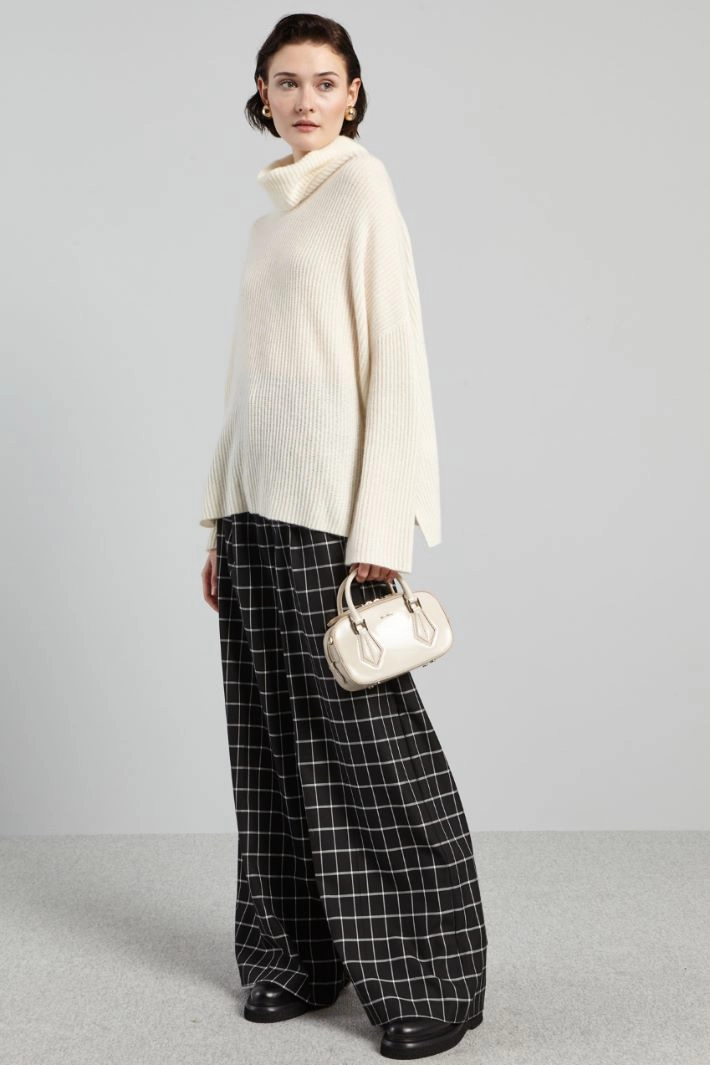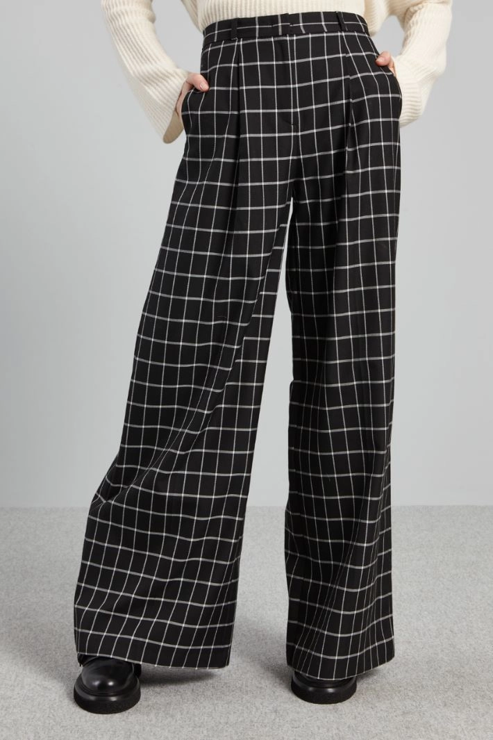 Wide flared trousers in yarn-dyed viscose blend batavia, with waistband and belt loops, inset side pockets. Hidden fastening with zip, button and hook.