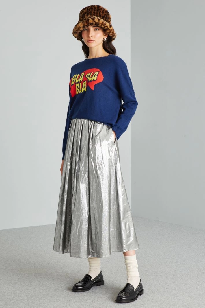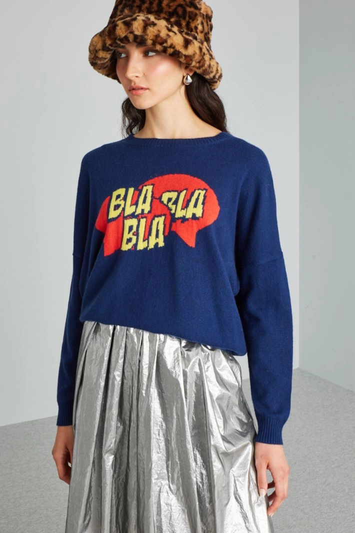 Loose-fit sweater in wool and cashmere yarn, with inlay on the front, crew neck, long sleeves with dropped shoulders and ribbed trims.
