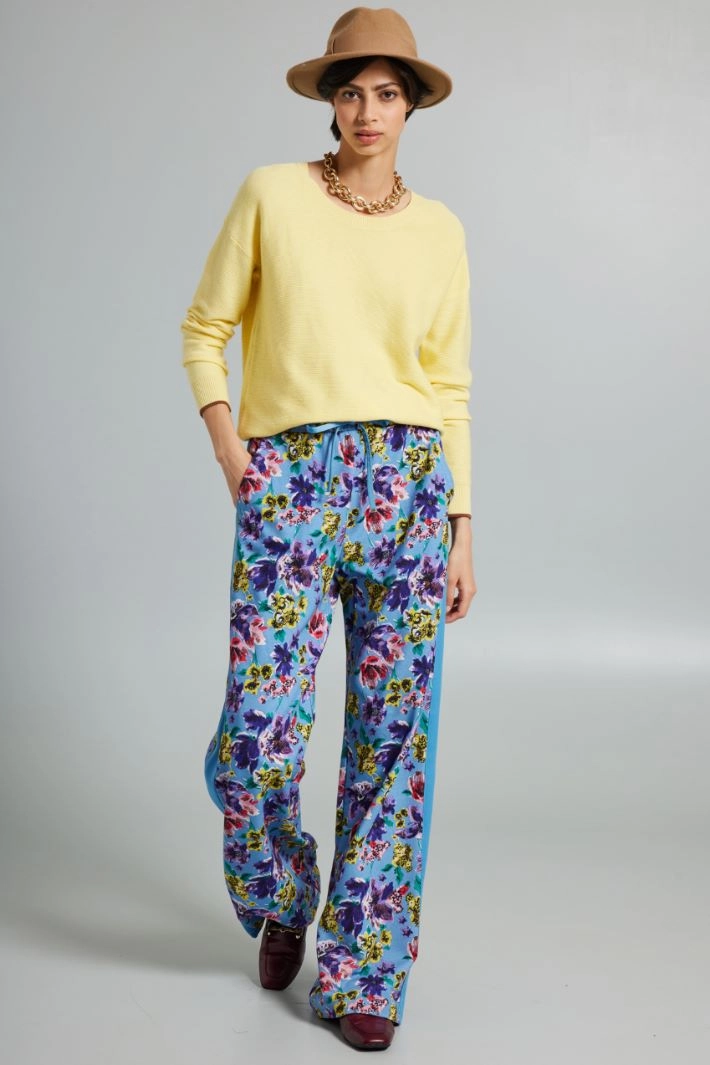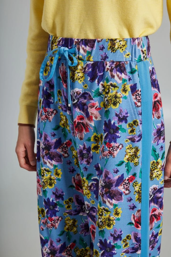 Straight, soft-fit trousers in heavy printed stretch cotton jersey, with drawstring at the waist, French pockets on the sides and side satin bands.
