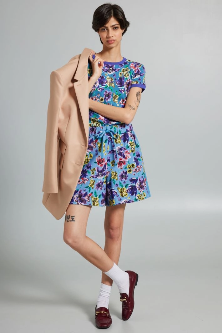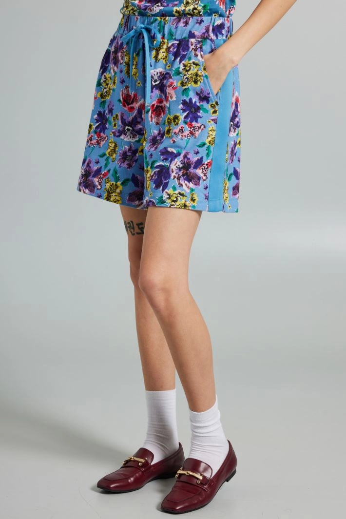 Flared Bermuda shorts in heavy printed stretch cotton jersey, with drawstring waist, French pockets on the sides and satin side bands.