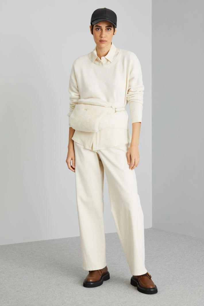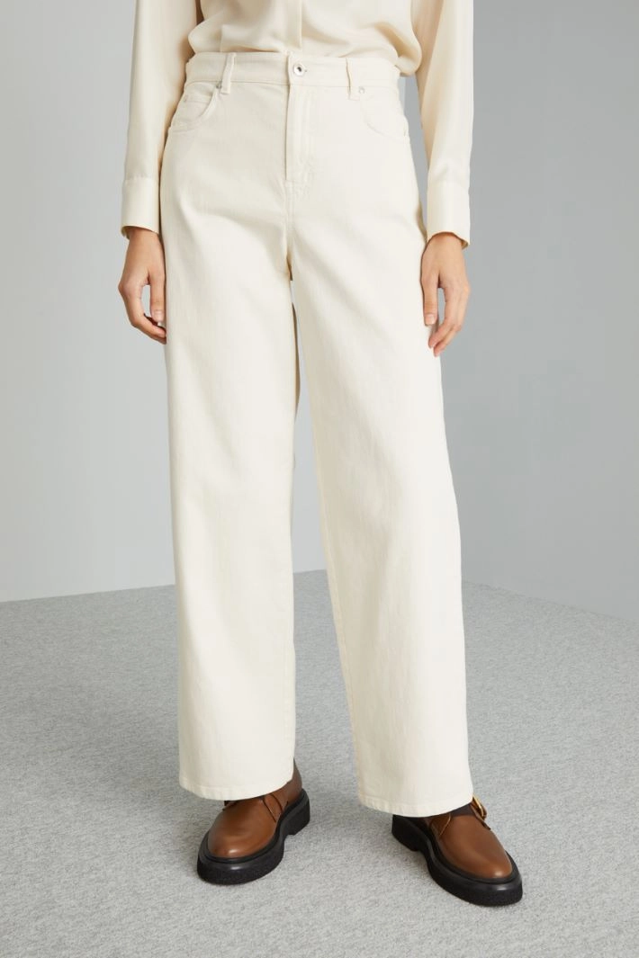 Wide, straight-cut trousers in stretch cotton bull, with belt loops at the waist and five pockets. Hidden zip and metal button fastening.