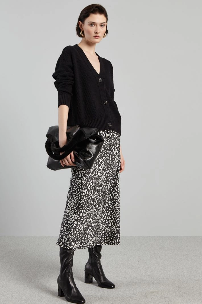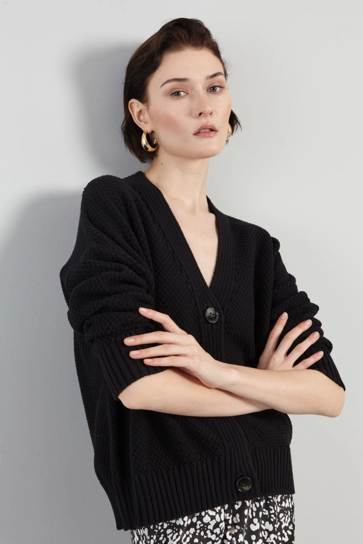 Cropped cardigan in soft cotton blend yarn, featuring a moss stitch knit. Oversized style with V neck, long sleeves and ribbed edges. Horn-effect button fastening.
