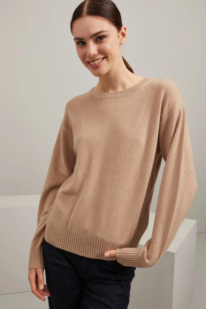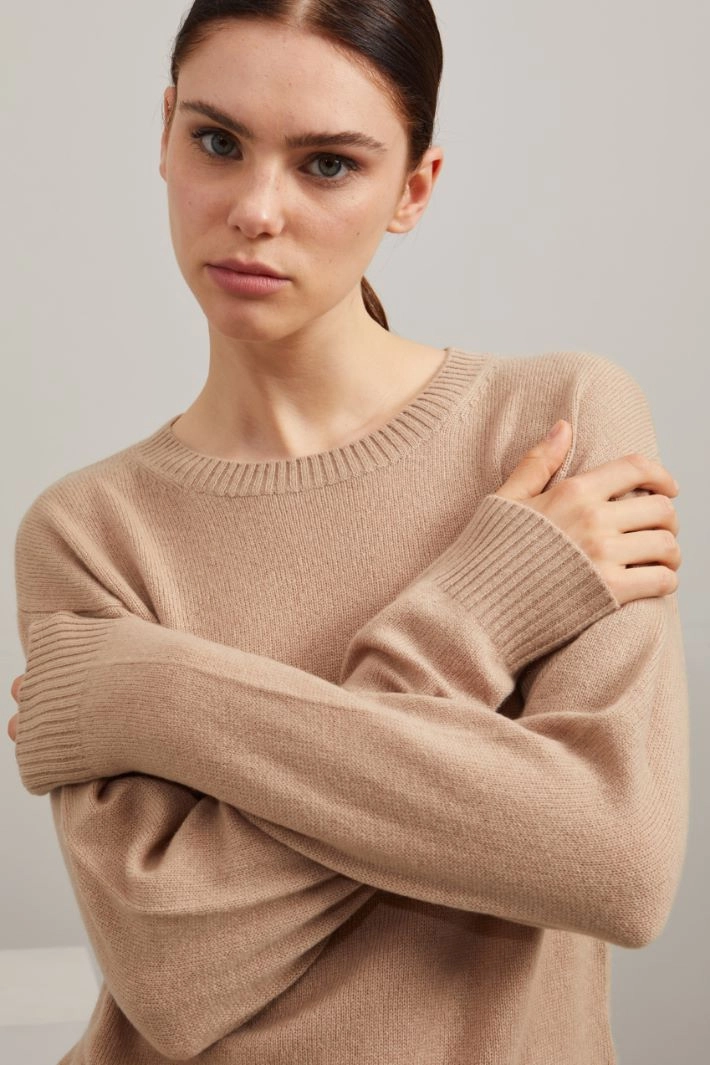 Straight fit sweater in pure cashmere yarn, with round neckline, long sleeves and ribbed finished profiles.