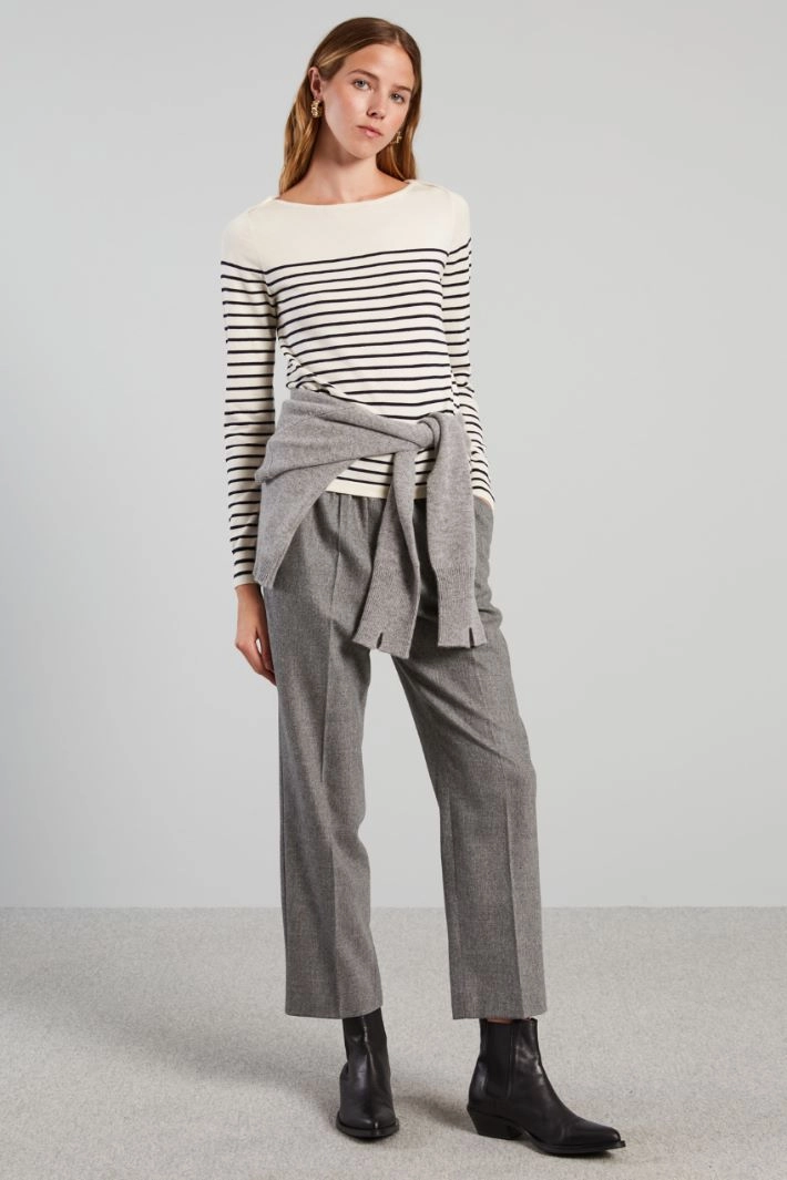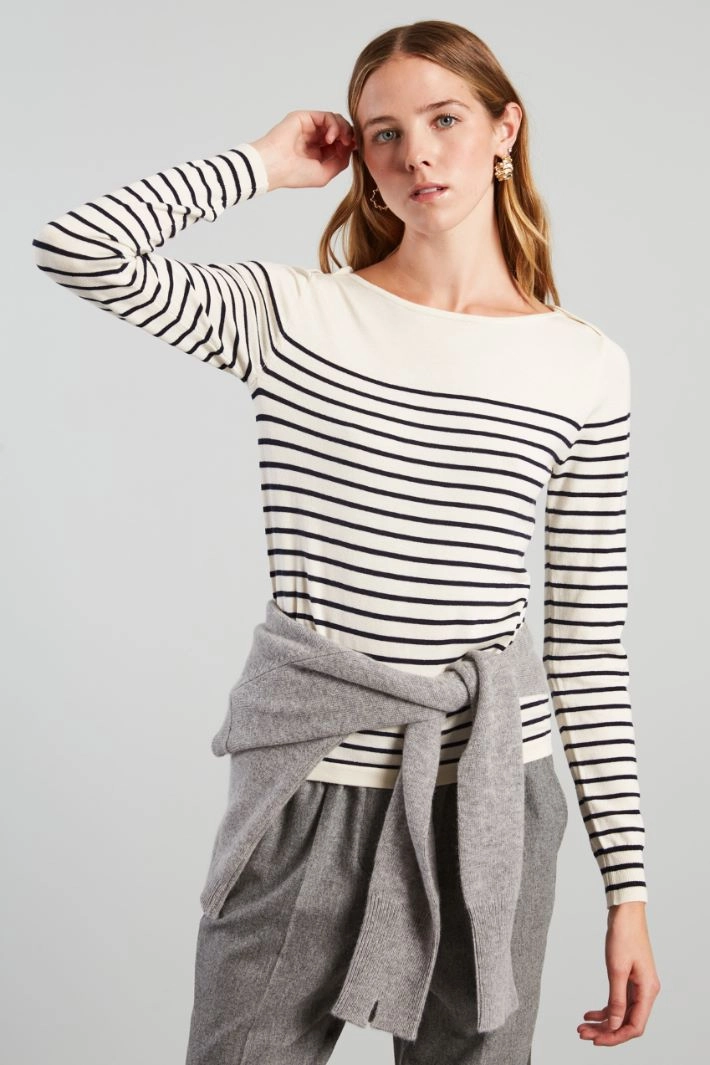 Regular fit stockinette stitched sweater in silk and wool yarn featuring a boat neckline and long sleeves.