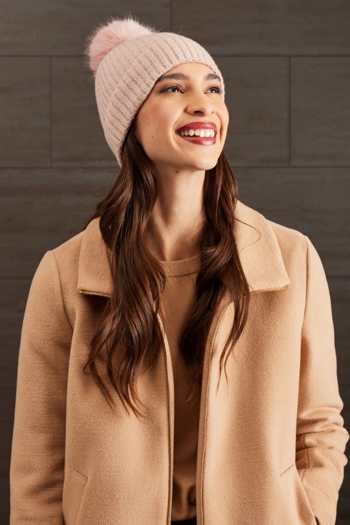 Beanie in ribbed viscose, wool and cashmere blend knit, with lamè insert, pom poms at the ends and turned-up bottom.