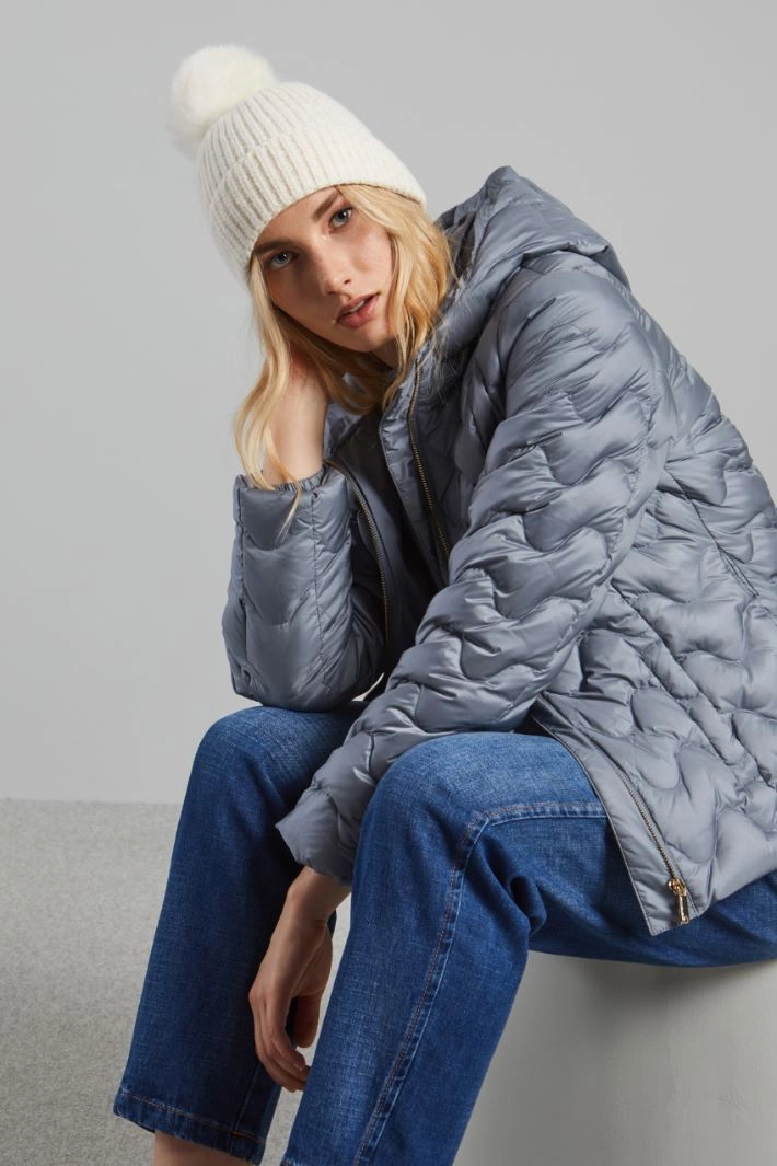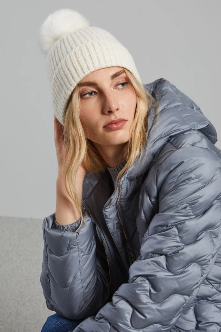 Beanie hat in wool, viscose and cashmere blend yarn, with lamé fiber insert, ribbing, pom pom at the top and turn-up at the edge.