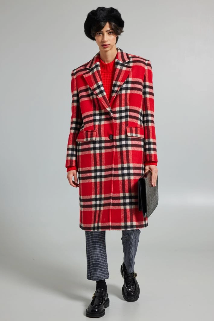 Long, oversized coat in yarn-dyed wool and viscose blend cloth, with lapel collar, long sleeves, padded shoulder straps, double welt pockets with flap and rear vent at the hem. Single-breasted button fastening. Lined.