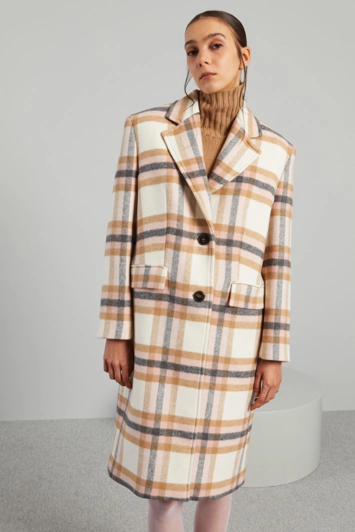 Long, oversized coat in yarn-dyed wool and viscose blend cloth, with lapel collar, long sleeves, padded shoulder straps, double welt pockets with flap and rear vent at the hem. Single-breasted button fastening. Lined.