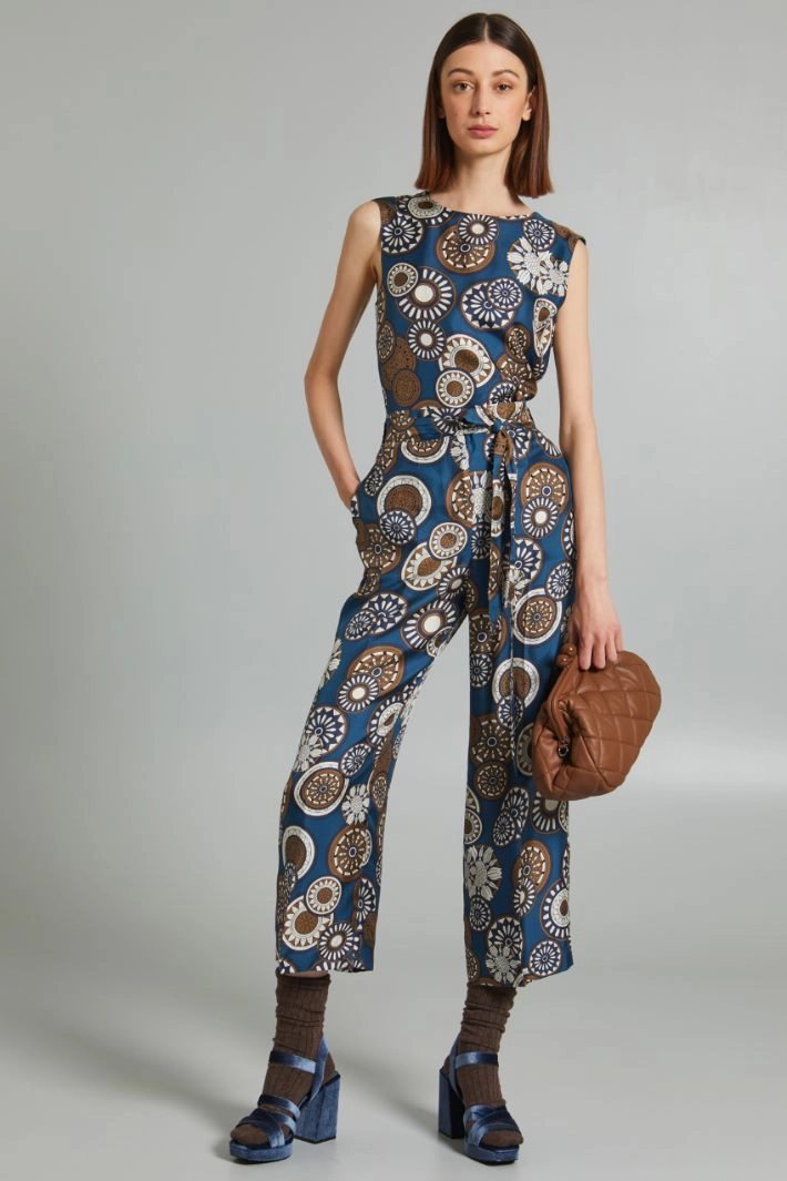 Fluid trousers in printed pure silk twill, with elastic insert at the waist on the back, inset side pockets and hidden fastening with zip, button and hooks. Matching sash.